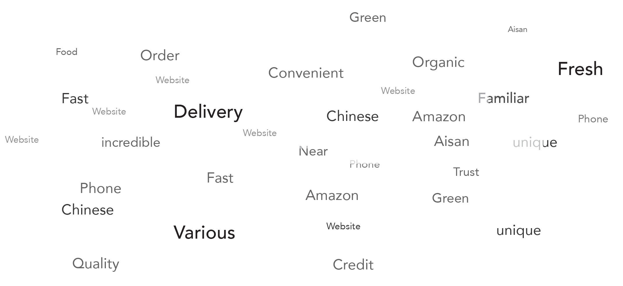 From the homepage of the website and the relevant comments of the client, I listed a list of words and made them into a word cloud. Through the analysis of relevant data, I found that "various", "Fresh", and "Delivery speed" are the most concerned aspects. Therefore, I decided to create an animation based on the above words, combined with the order process of the website.